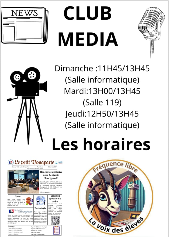 Au lycée Bonaparte, les clubs sont bien plus que des activités : ce sont des lieux de rencontre, de curiosité et de passion. Ils permettent à chaque élève de découvrir de nouveaux horizons, de développer ses talents et de s’impliquer dans la vie du lycée.